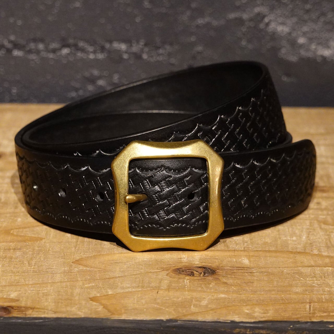 イタリアンレザーを使用したレザーベルトです。バスケット柄の型押しが表面に綺麗に施されています。使い込むごとに革本来のツヤ感が出て、経年変化も楽しめます。職人の手により丁寧に仕上げられた渾身の一本。レザーに真鍮なんて、たまらんですよね。バックル裏のロゴスタンプも最高です。
